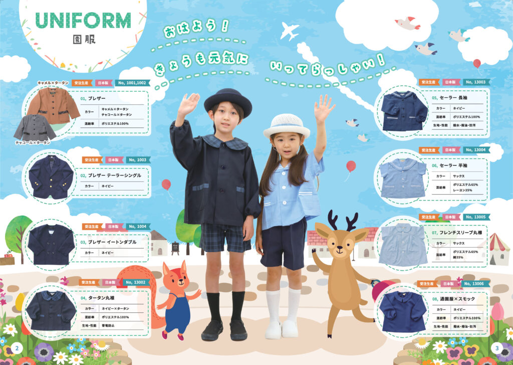 内容は今のトレンドを意識した掲載商品になっており、例えば、通園服とスモックの両用途を兼ね備えた新商品や、イージーケア性に優れたのブラウス、制服のズボンは丈長仕様で男女兼用、汚れの落ちやすい素材を使った体操着やポロシャツ、抗菌防臭の洗える帽子などなど、盛りだくさんでございます。